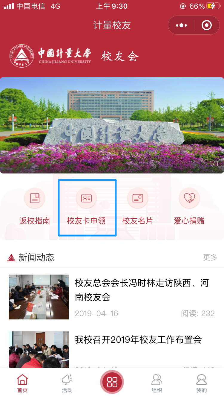 2、未办理校友卡的校友,可以通过“计量校友”微信小程序,准确填写相关信息,提前办理电子校友卡。