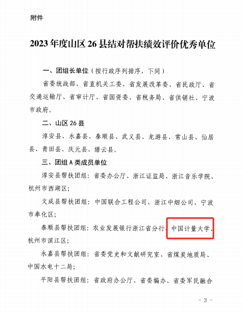 近日,中共浙江省委农村工作领导小组办公室、浙江省乡村振兴局发布《关于公布2023年度山区26县结对帮扶绩效评价结果的通报》,中国计量大学荣获2023年度结对帮扶“双向赛马”绩效评价优秀团组A类成员单位,是泰顺帮扶团组获评优秀的三家单位之一。