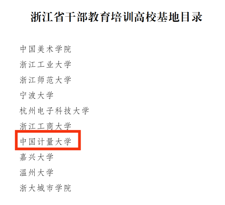 近日,中共浙江省委组织部、中共浙江省委教育工作委员会印发《关于发布全省干部教育培训高校基地目录的通知》,为进一步加强和规范高校干部教育培训工作,经省委组织部、省委教育工委研究,确定10所高校为全省干部教育培训高校基地,中国计量大学成功入选。
