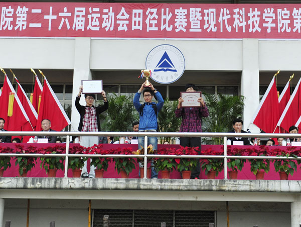 在本次运动会中,经济与管理学院获得了我校第二十六届运动会田径比赛学生组总成绩第一名,计测学院、质安学院分获二、三名;现代科技学院分工会获得了第二十六届运动会田径比赛教工组总成绩第一名,机关分工会、计测学院分工会分获二、三名;经济与管理系获得了我校现代科技学院第八届田径运动会学生组总成绩第一名,机电工程系、计测工程系分获二、三名。最后,计量测试工程学院获得了我校第二十六届运动会团体总分第一,夺得了“计量杯”。此外,大会还宣布了体育道德风尚奖和优秀组织奖获奖个人、单位名单。学校领导向获奖单位代表颁发了奖杯和奖牌。