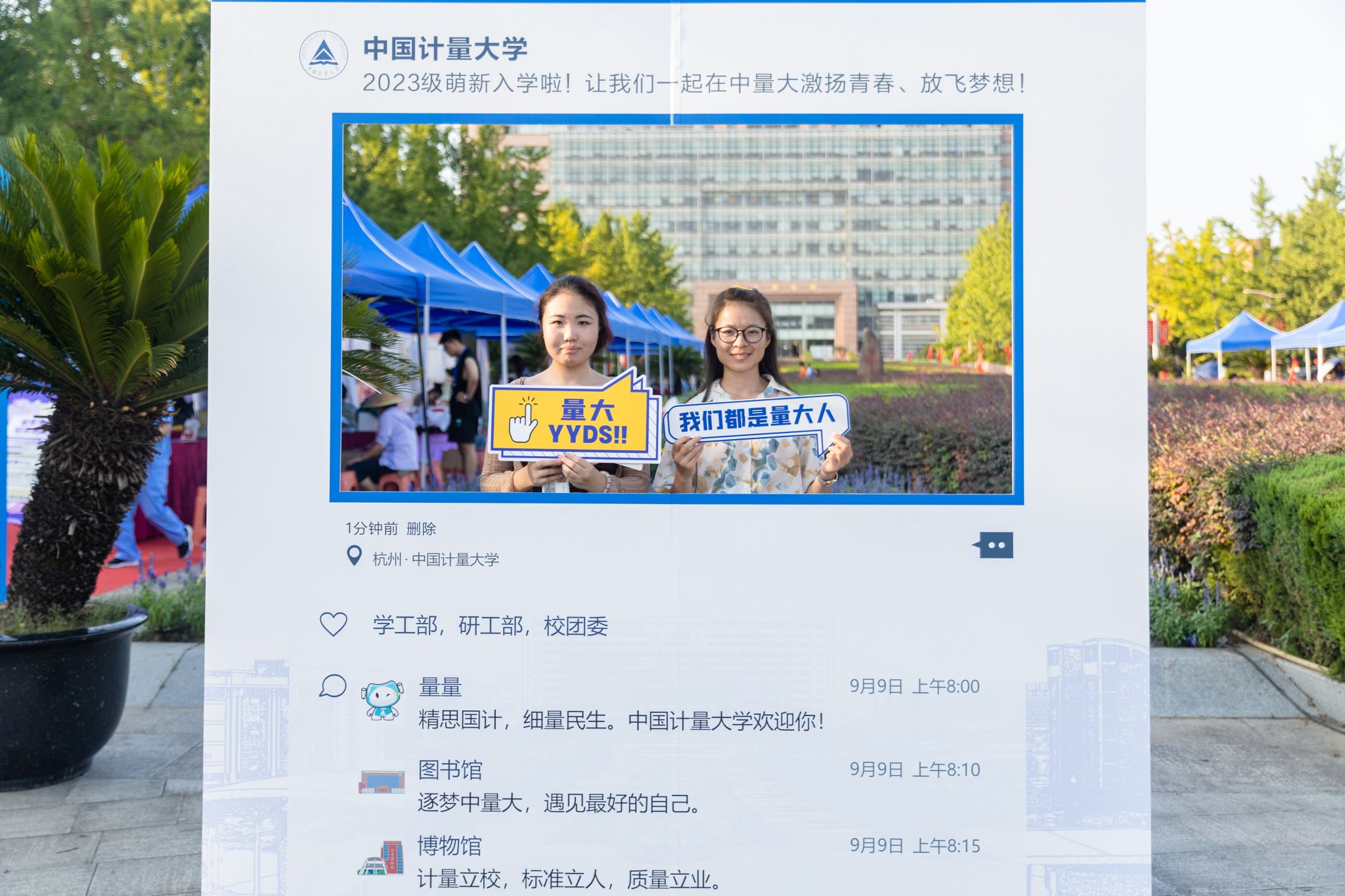 2023届本科毕业生就业质量、2023届本科毕业生升学光荣榜、研究生教育简介、各学院介绍……一块块大型喷绘前,吸引新生驻足停留、拍照记录。学校利用开学季,集中展示优秀毕业生情况、学院优秀成果等,上好爱校荣校教育“开学第一课”,让新生们第一时间感受计量文化,体验不一样的“文化课”。