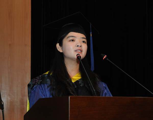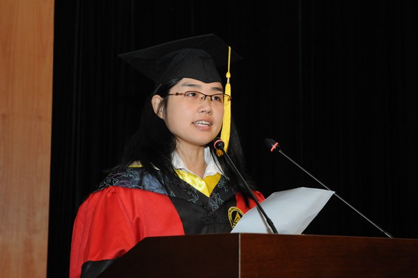 信息学院研究生魏莎莎代表全体硕士学位获得者对母校和老师们的辛勤培育表示衷心的感谢和崇高的敬意。他们表示将谨记母校的教诲,始终秉承“精思国计,细量民生”的校训,锐意进取,不断创新,为国家和社会的发展做出自己的贡献。