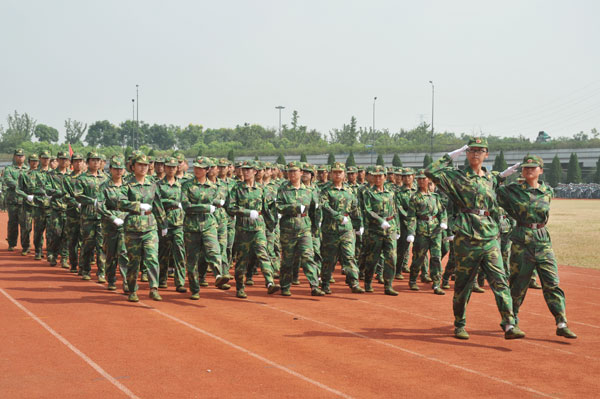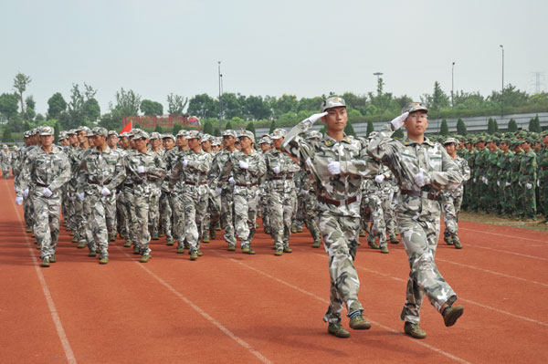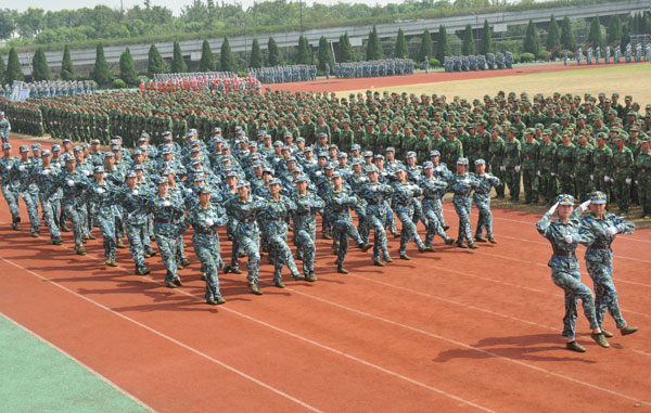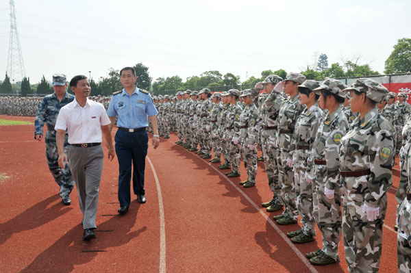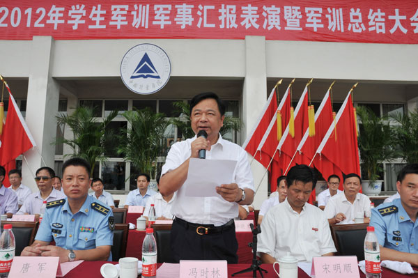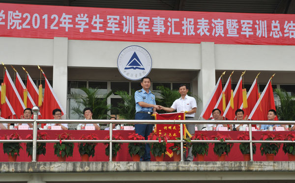 9月7日上午9:30,我校2012年学生军训汇报表演暨总结表彰大会在北田径场隆重举行。校长林建忠,校党委副书记徐涌金、陶伟华,副校长冯时林、俞晓平、宋明顺,校纪委书记王小华,党委委员、学生处处长范庆瑜,空军28师首长范俊华、嘉兴场站副站长唐军、秘书科科长唐新亮,及各二级学院领导、全体军训工作领导小组成员出席大会。大会由党校办主任杨政主持。