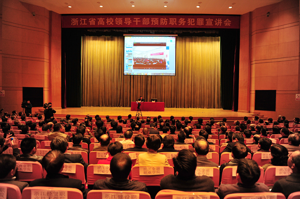 “让我们在总书记讲话精神的指引下,积极行动起来,为我省的反腐倡廉工作有效落实和预防腐败做出更大贡献。”12月2日,浙江省人民检查院党组副书记、副检察长顾雪飞在我校嘉量大会堂作了一场关于预防职务犯罪的宣讲报告。这也是近日浙江省检察院在全省集中开展的百场领导干部预防职务犯罪宣讲活动的重要内容之一。宣讲会由浙江省教育厅厅长刘希平主持。各高校党政领导班子成员、在杭高校重要部门负责人、教育厅机关各处室直属单位负责人、我校全体中层干部及重点岗位人员等近500人参加了宣讲会。