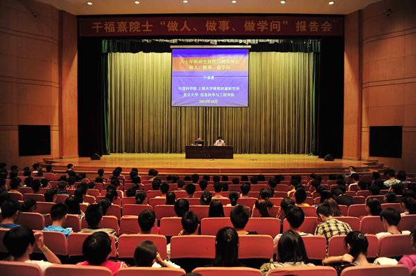关于学习,干院士望着台下的求知者,十分严肃地给出了自己的观点。首先,要学好外语,用好这个工具对论文的发表和知识的宽广度都有十分重要的意义。干院士回忆起自己去苏联学习的经历,当时他仅仅用了三年时间,就能用俄语写论文,很快赢得了大家的尊敬。其次,要具有创新精神,不做重复性的工作,做学问要踏实、有目的,善于利用身边的资源,善于把握机会。干院士表示,他喜欢年轻人学习的氛围,做学问就应该这样,充满活力和朝气才能有新的思想成果。