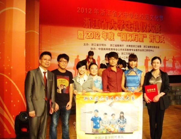 作为2012年浙江省大中学生校园文化节的重要活动,中国计量学院、浙江工业大学、温州大学、浙江万里学院、浙江水利水电专科学校、宁波大红鹰学院等20所学校参加了这次比赛,从今年5月开始经初赛、复赛,最后产生10强进入决赛。在领队人文社科学院陈清清老师的带领下,由10公关1班罗礼、10公管1班陈雲梅、11公管1班赵婧雯、11公管1班杜浩杰组成的参赛队伍敢于拼搏、表现不俗,最终获得一等奖成绩。比赛由知识问答、自我介绍、才艺表演、情景演示四个部分组成,在礼仪情景演示环节,10所高校的参赛队运用小品等表演方式,展示了职场礼仪、服务礼仪、宴请礼仪、婚礼礼仪、航空礼仪、宫廷礼仪等内容,生动地表达了选手们对文明的理解、对礼仪的诠释、对生活的热爱。