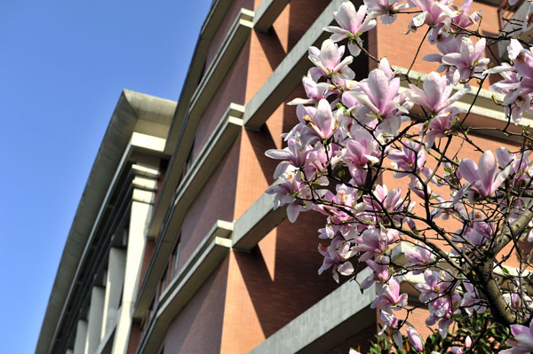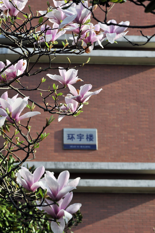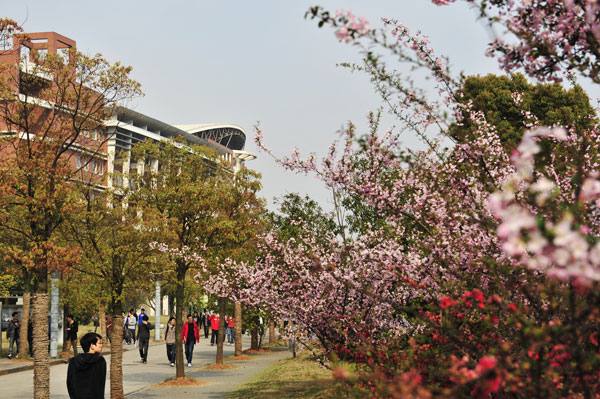 初春时节,阳光明媚,这本是出门踏青的绝好机会,但是今年师生们却不用专程去郊外寻花,只要走出教室的大门,校园内处处都是春意盎然的景色。学校大门口校名石碑下,一盆盆的瓜叶菊争相斗艳,翔宇楼前朵朵玉兰花安静地绽放,围栏边的海棠娇柔艳丽,有如晓天明霞。日月湖畔芳草铺地,绿树婆娑,启明广场边樱花烂漫,春风吹过,片片花瓣飘飘洒洒,徐徐落下,瞬间仿佛还能闻到一阵悠然的樱花香味。
