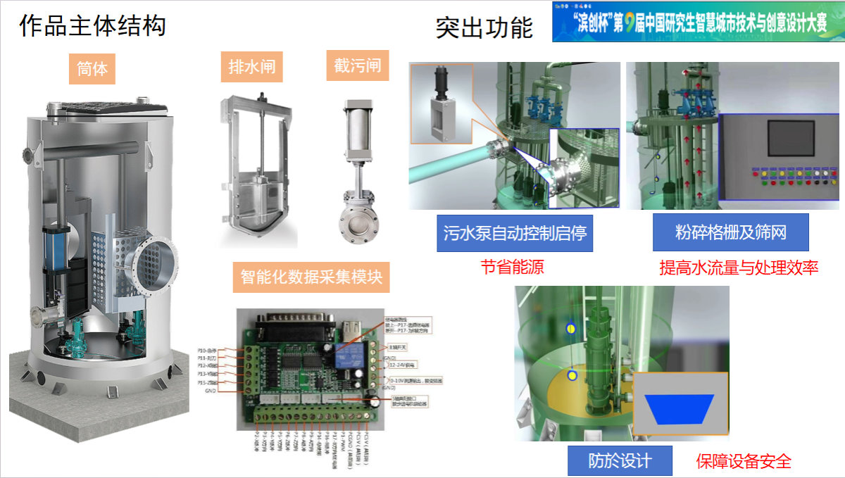 “水到渠成——城市水源智慧调配建设者”项目筹备了近2年时间,团队针对城市水资源调配设备维修安全弊端、沉淀垃圾和漂浮物清理困难、控制系统缺少智能化、泵系统能效低等问题,开发了智慧节能的一体化预制泵站及监测系统,突破国内现有预制泵站产品技术瓶颈问题,在节能高效、智能控制、安全防护等多个性能得到提升,该产品环保、智能、安全、稳定、节能,集成了筒体结构、水泵系统、格栅系统、阀门系统、管道系统、液位控制系统等。搭建的智能控制及远程监控系统,实现全自动数据传输。