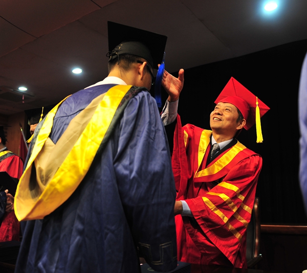 在欢快的音乐声中,主席台校领导为硕士学位获得者颁发学位证书、拨正流苏并合影留念。