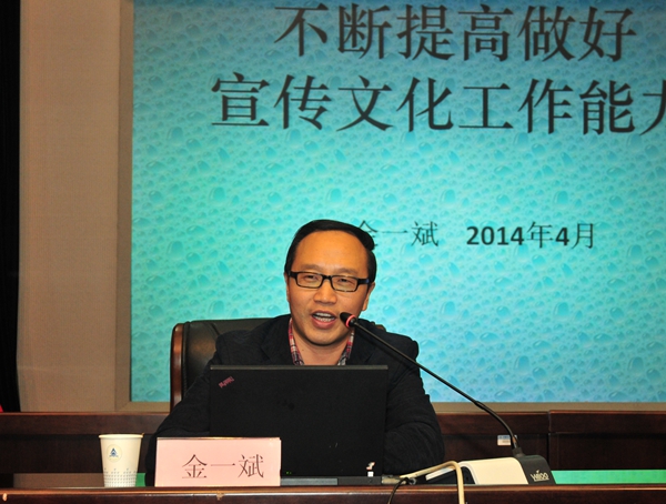 金一斌以《不断提高做好宣传文化工作能力》为题,就学习习近平总书记关于宣传意识形态工作讲话精神,加强和改进高校思想政治教育进行了专题辅导。他从三个方面进行了全面深入阐述。第一,意识形态工作是党极端重要工作。目前我国“一主多元”文化结构、“西强东弱”的政治格局以及社会转型的艰巨任务,凸显和决定了意识形态工作的重要性。第二,意识形态领域斗争具有长期性和复杂性。表现在当前我国政治、社会、文化、网络、宗教等各个方面。第三,要增强宣传文化工作的“三个意识”,即政治意识、政权意识、阵地意识,把握工作“三权”,即对意识形态工作的领导权、管理权、话语权。金一斌指出,高校宣传文化工作要坚持围绕中心、服务大局、增强自信,要加强理想信念教育,坚持党性与人民性相统一、坚持团结稳定鼓劲和传递正能量,坚持宝贵经验、舆论引导要讲究“时、度、效”,要宣传和阐释好中国特色社会主义理论体系,体现中国特色、讲好中国故事、传播中国好声音,要树立大宣传理念,最终将宣传思想工作落实到巩固马克思主义在意识形态领域的指导地位、巩固全党全国人民团结奋斗的共同思想基础上来。