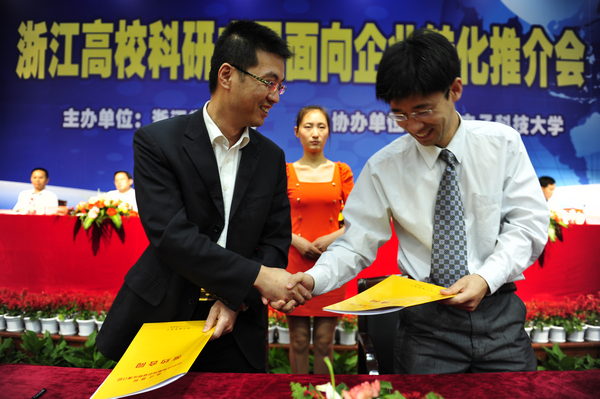 会上,浙江省委副书记、省长夏宝龙做了重要讲话,他强调科技成果转化是促进科技与经济紧密结合的关键环节,高校是科技创新的主力军,企业是科技成果转化的关键,要切实加强组织协调服务,推动高校和企业结成更加紧密的技术创新战略联盟,努力把更多科技成果转化为现实生产力,为推动我省加快发展、高质量发展提供强大动力。夏省长摁下了启动浙江省高校科研成果面向企业转化信息平台的按钮,包含我校科技成果推广网站在内的浙江省高校科研成果面向企业转化信息平台正式开始运营。推介会上举行了签约仪式,我校计测学院蒋庆老师与浙江盾安人工环境股份有限公司代表签订了科技合作协议。