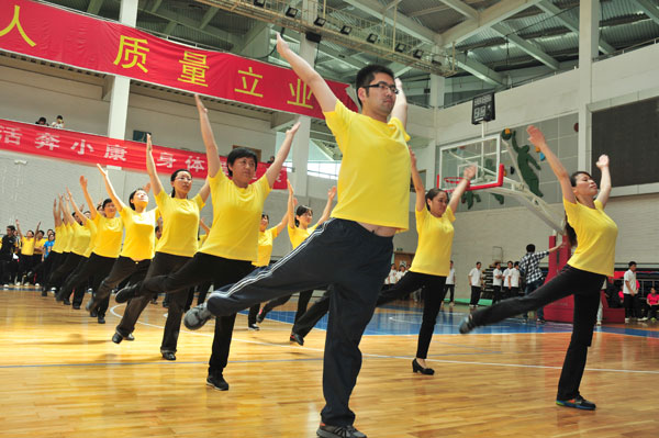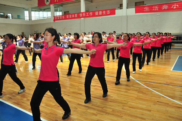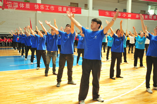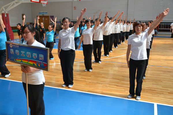 启动仪式后,教工第九套广播操比赛正式开始。赛场上,各代表队着装统一,参赛队员精神饱满,动作规范准确、整齐划一,充分展现了我校教工朝气蓬勃、健康向上和团结拼搏的精神面貌。经过激烈的角逐,机电工程学院荣获第一名,外国语学院、质量安全与工程学院、图书馆、机关、后勤、现代科技学院、成人教育学院分获第2至8名。自去年5月校工会推广教职工“工间操(第九套广播体操)”活动以来,各分工会利用不同场所,在每天上午大课间时段组织本单位教工进行“工间操”锻炼活动,为此次比赛奠定了良好的基础。比赛前夕,分工会更是从规范每一个动作入手,积极组织教职工认真训练,不断提高做操质量。各二级单位党政非常重视和支持本次比赛,领导亲自带队训练和参与比赛。比赛排名有先后,但大家积极参与健身的热情和团结一致为集体争光的精神却同样值得肯定和赞赏。正如一些分工会干部所言:“通过开展工间操活动和组队训练带动大家集体参与健身,这才是活动和比赛的真正意义。”