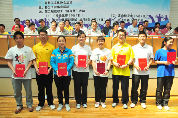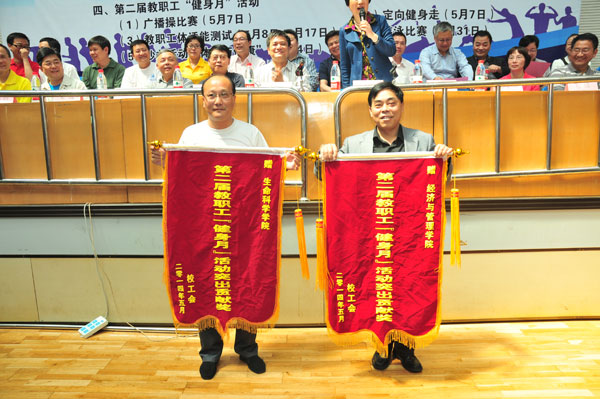 胡建成书记代表组委会向经济与管理学院、生命科学学院颁发了“第二届教职工‘健身月’活动突出贡献奖”锦旗。获得2014年度教工羽毛球比赛前8名的单位上台领取了荣誉证书。