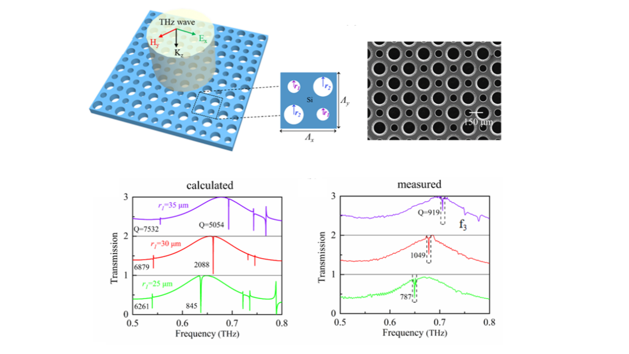 该研究设计制作了一种基于BIC的全硅超表面,在太赫兹波段实现了最高Q因子为1049的偏振不敏感准BIC谐振,谐振Q值超过了目前最高记录的3倍。另外,团队还利用这种高Q超表面,展示了低光功率激发的太赫兹调制特性。该项工作是研究团队在太赫兹一维光子晶体中获得国际最高谐振Q记录后在该领域的又一项重要成果,为高Q太赫兹超表面的研究和应用铺平了道路。