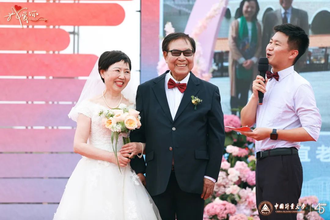 爱就是一路上互相搀扶,共同成长,风雨同舟。离退休教师杨汝月、熊静宜是这次集体婚礼上婚龄最长的夫妻,他们是本科同班同学、研究生同级同专业同学,都来自浙江。曾经同是理学院教师的他们,已经相濡以沫55年。今天,学校见证他们的“绿宝石婚”,是一份独有的浪漫。