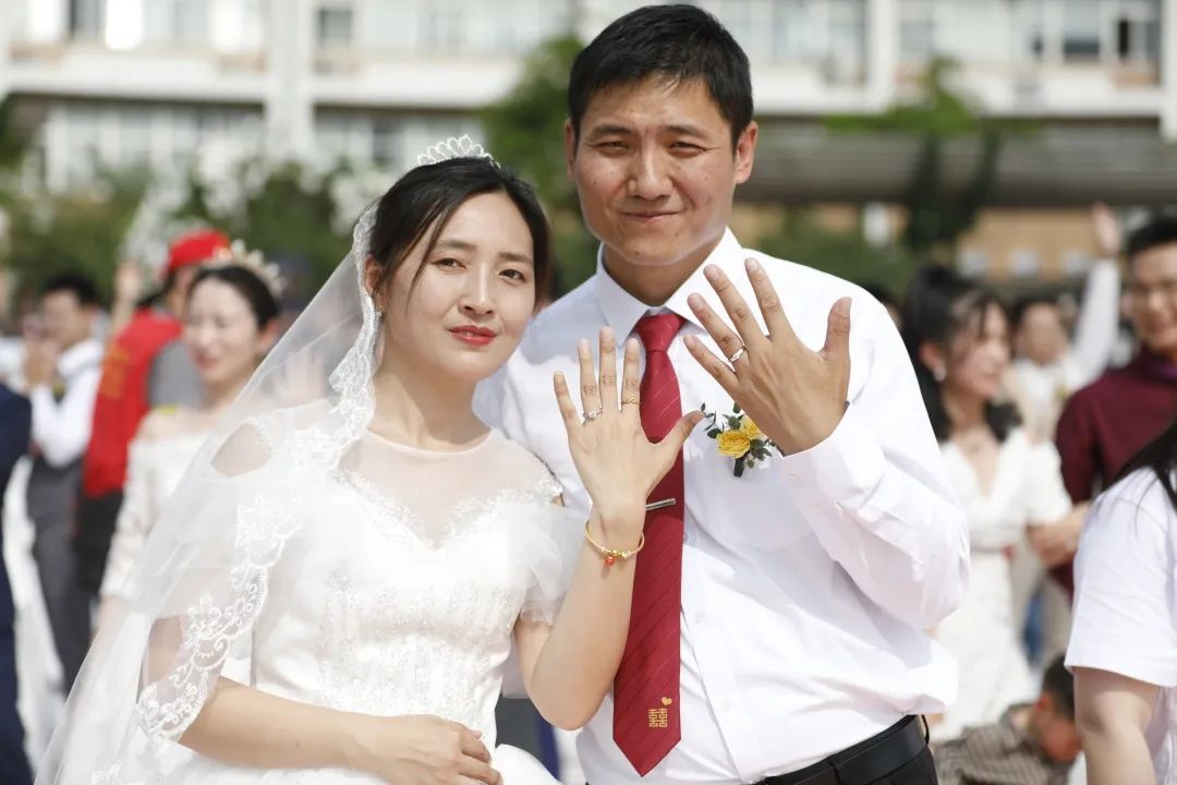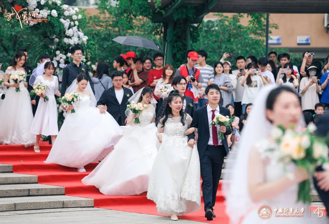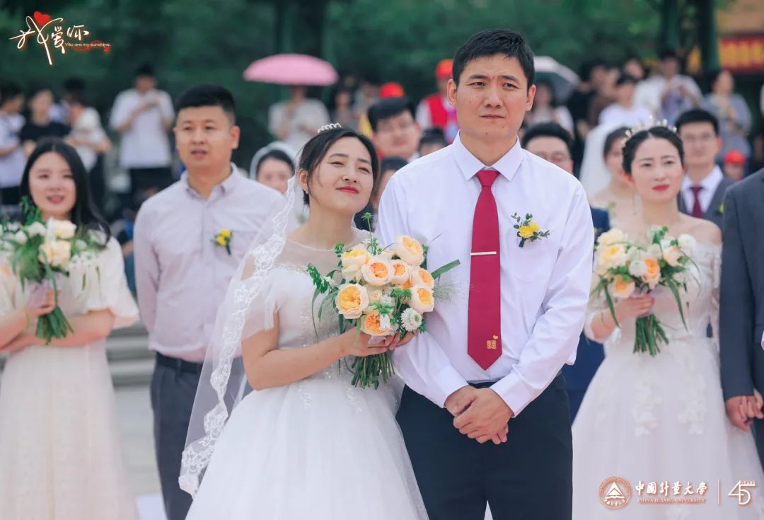 均钟合唱团带来歌曲《今天你要嫁给我》,幸福感在现场弥漫。新人们伴着歌声互相对视,或微笑牵手,或感动落泪。学校精心为每一对新人准备了伴手礼,包含定制戒指、喜糖礼盒、定制婚书、定制U盘、定制水杯,让新人们感受到母校的拳拳爱意。新郎新娘取下定制戒指,为眼前这位共度余生的爱人戴上。而对于史叶欣和王月华来说,这场婚礼比其他人多了一层特别的含义,这是他们第一次举办正式的婚礼。“我们在2020年12月领证了,但一直没办婚礼。感谢母校为我们举行了这次仪式,对我们来说意义重大。”史叶欣说。在浪漫、欢乐的领舞气氛中,新人们共同起舞,为集体婚礼划下句点。