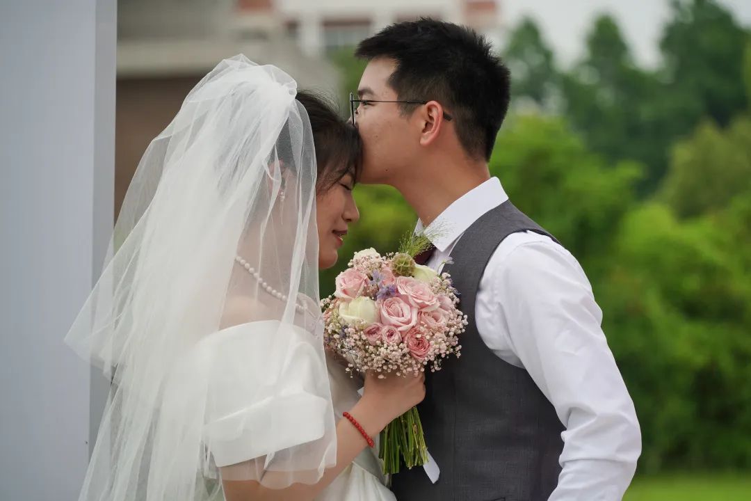 相守到白头的爱情让人羡慕,新婚夫妇的甜蜜互动同样传递出幸福。“我和他是同班同学,刚来到量新学院的时候就认识他了。有一次晚自习我在偷偷抹眼泪,他当时坐我前桌,回头递给我一张纸巾,很小声地说:‘你的眼睛出汗啦,快擦擦!’我立马就被逗笑了。”量新学院2021届毕业生邓卉彤、范金涛作为新人夫妻代表讲述了他们的爱情故事。去年8月他们刚刚结婚,如今,邓卉彤在西湖大学读博,范金涛在浙江工业大学读研,两人偶尔也会再回到下沙,坐着那趟熟悉的3113公交车,来看看量新学院可爱的老师们,抱半个西瓜坐在操场边看学弟学妹们打球跑步,一起回忆青春的大学时光。