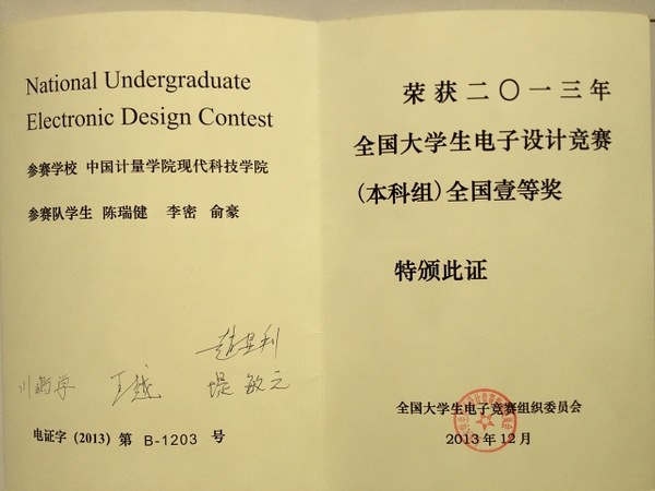 本届大赛全国共有1069所院校、11036支队伍、33108名大学生最终完成并提交了作品,大赛评出国家一等奖240队,国家二等奖566队。我校现代科技学院共获得国家一等奖1项、浙江省一等奖7项、浙江省二等奖2项、浙江省三等奖2项,其中测控101班陈瑞健、李密、俞豪三位同学(指导教师:何翔)组成的团队获大赛一等奖,刷新了我校参加此项赛事以来的最好成绩。