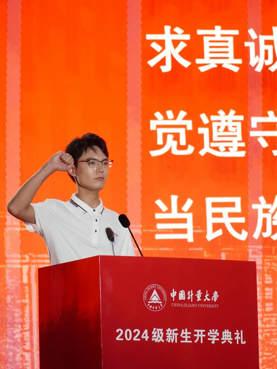 “在入校之际我郑重宣誓,我是中国计量大学的学生,我愿秉承‘精思国计、细量民生’的校训,我愿弘扬‘严格严谨、求实求新’的校风,我愿传承‘励志笃学、求真诚行’的优良学风……勤奋学习,全面发展,努力成为堪当民族复兴重任的时代新人。”法学院法学专业2024级本科生俞子扬上台领誓,2024级全体新生一起举起右拳,澎湃激昂的入学宣誓回应使命召唤,将成为每一位量大人“知行合一、学以成人”的行动指南。