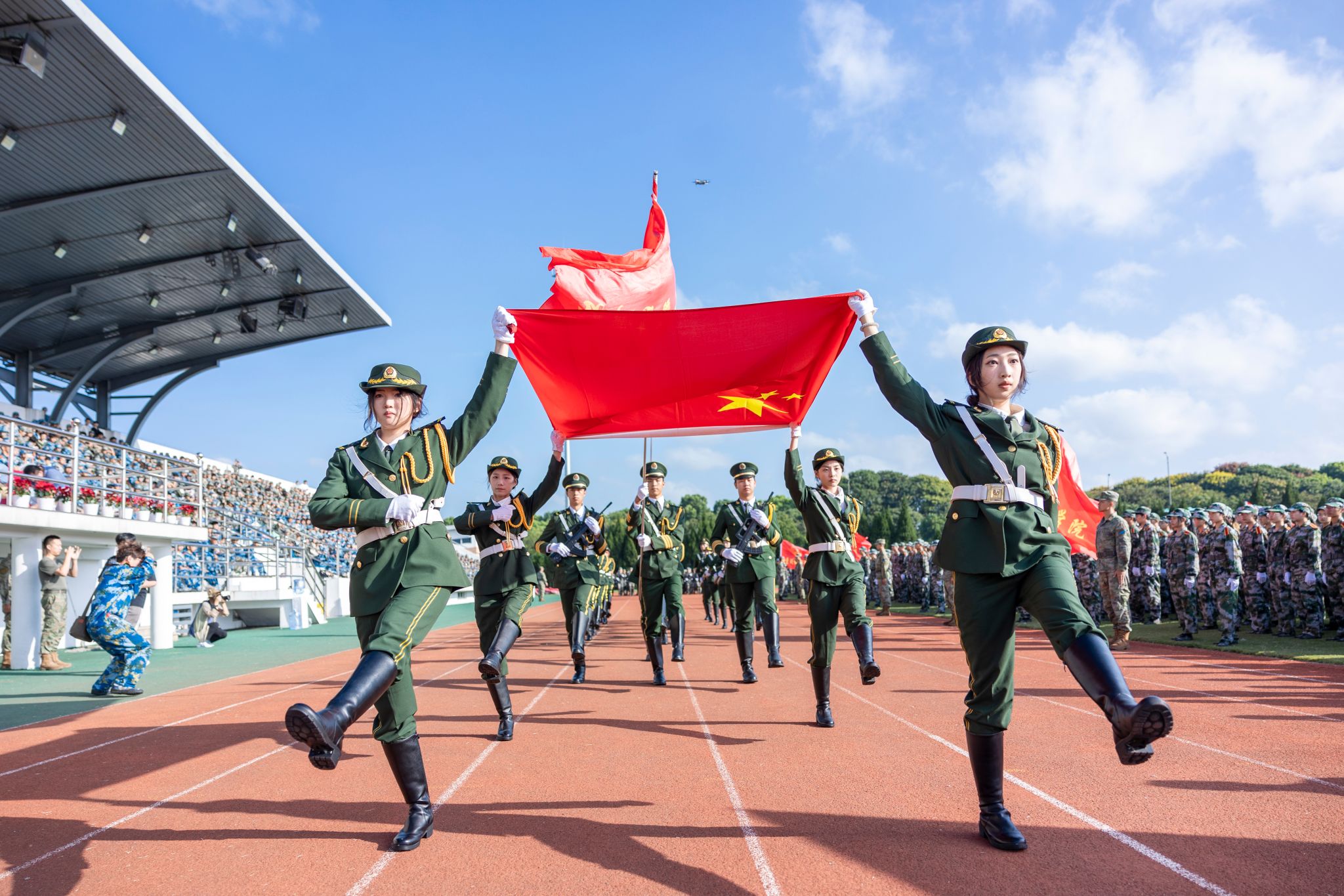 戎装在身,热血在怀。分列式上,国旗护卫队持枪方阵迈着铿锵的步伐依序向主席台走来,他们英姿挺拔、步履划一。各营方阵紧随其后,阔步走来、气宇轩昂,阳光下汗水淌过的脸颊,早已褪去青涩懵懂,充满坚毅自信。