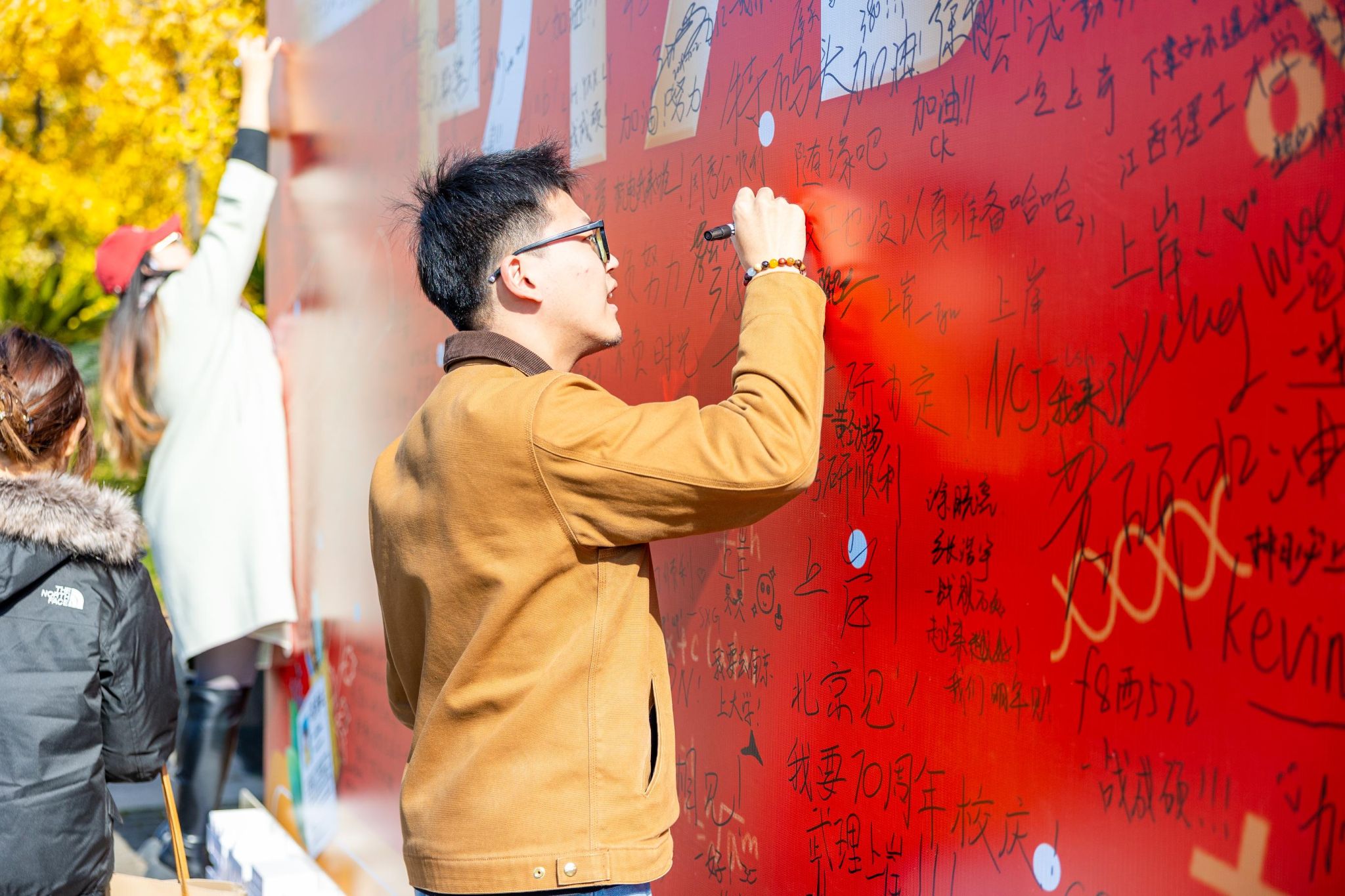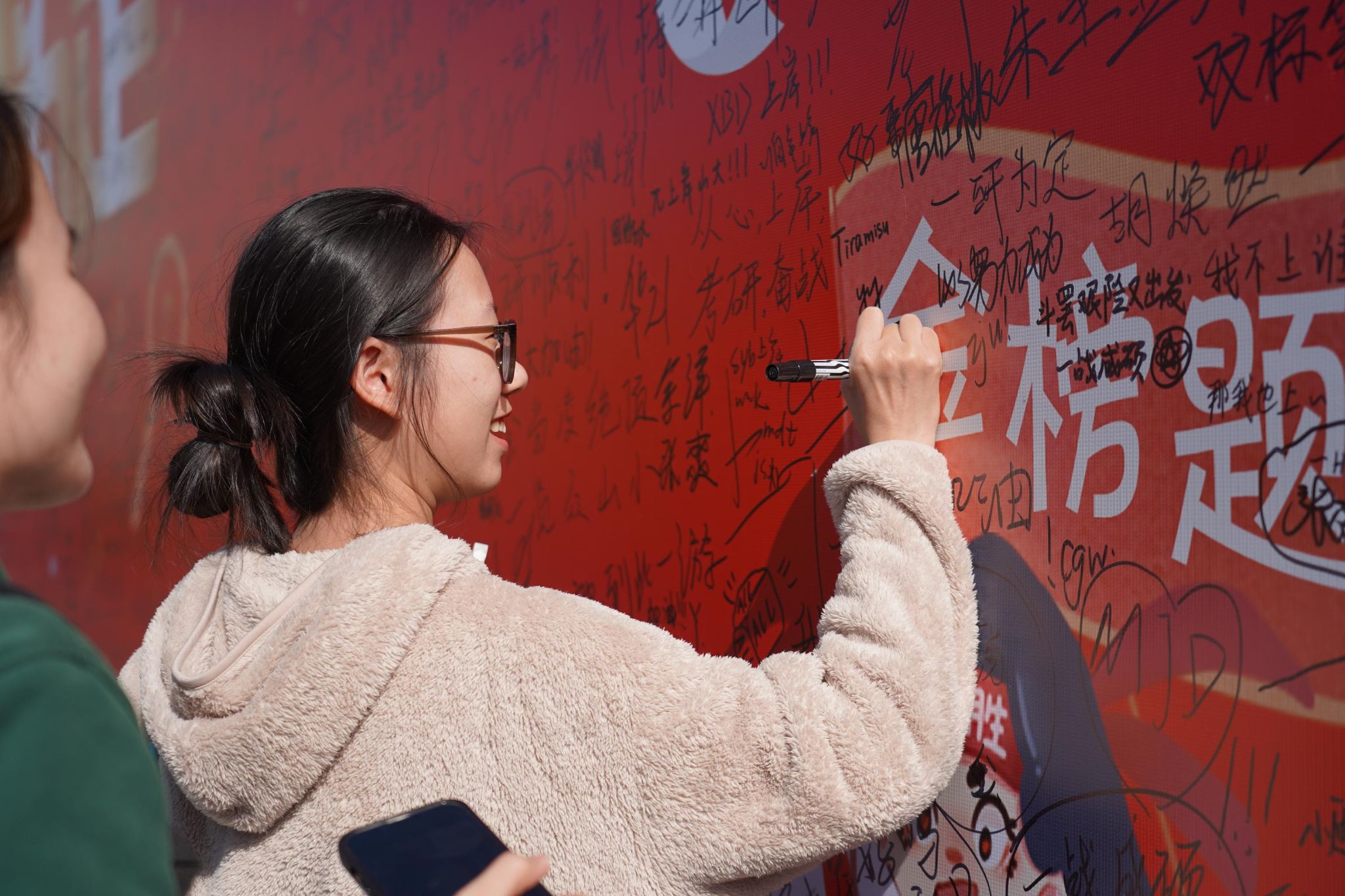 “一定上岸!”“考研必胜!”“一战成硕!”同学们在签名墙上留下自己的愿望和祝福,共同期待一个美好的未来。