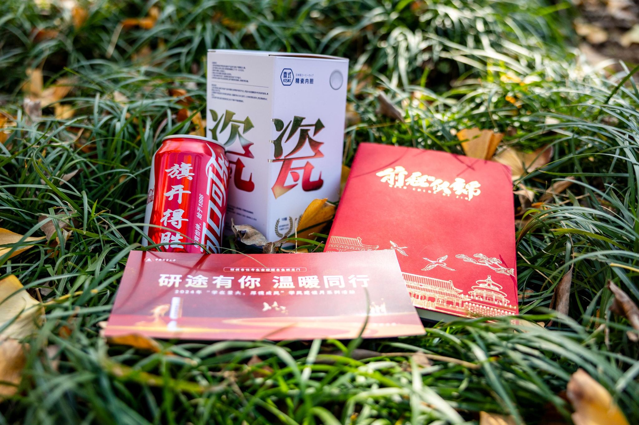 今年的考研大礼包里包含保温杯、笔记本、定制可乐和祝福卡片。21级光电专业的司双威是学校“天健育人计划”的一员,前三年他都在考研慰问活动的幕后,为考研同学传递温暖,今年角色转变,他成为被慰问的对象。“保温杯捧在手中,仿佛握住了学校对我们的关怀与期待,在寒冷的冬日,它将持续为我带来温暖,恰似学校的支持,源源不断,永不缺席。” 司双威说。