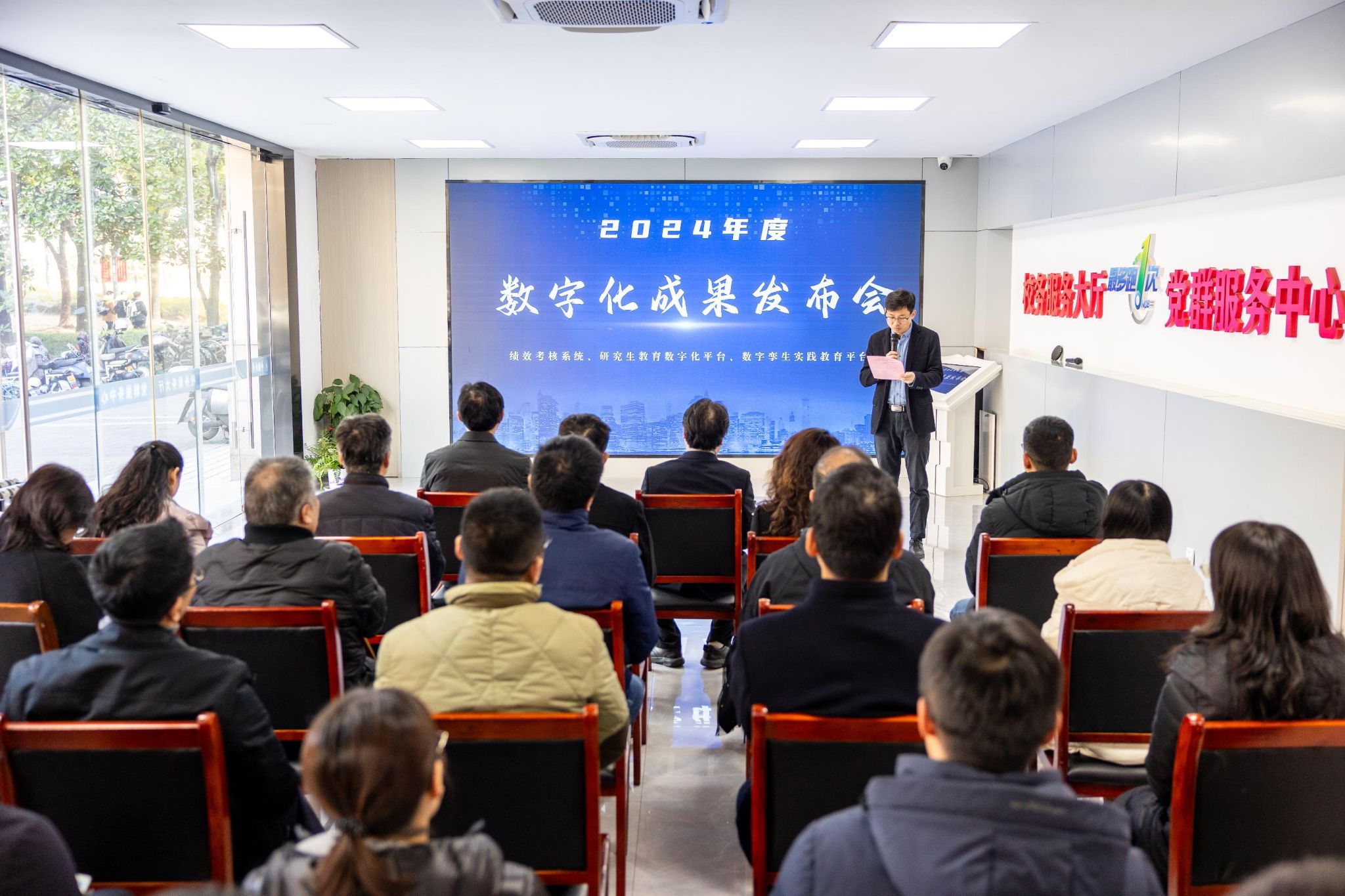 1月9日,学校2024年度数字化成果发布会在校务服务大厅举行。校党委书记徐江荣、副校长王新庆出席发布会,并为绩效考核系统、研究生教育数字化平台和数字孪生实践教育平台三大平台正式启用揭幕。发布会由办公室主任汪俊斐主持,数字化改革工作领导小组成员参加,共同见证了学校数字化建设的丰硕成果。