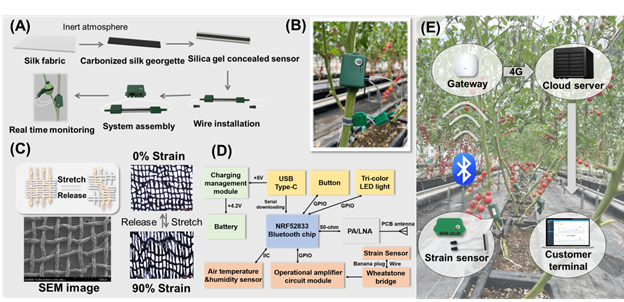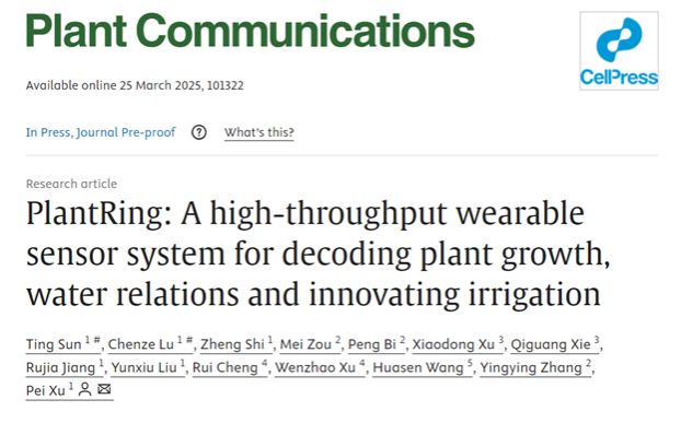 近日,我校生命科学学院徐沛研究员团队在Cell 出版社旗下Plant Communications杂志(生物学一区TOP期刊,IF 9.4)发表了题为“PlantRing: A high-throughput wearable sensor system for decoding plant growth, water relations and innovating irrigation”的研究论文,在植物表型计量领域取得重要进展。团队通过与清华大学等合作,研发了高通量、低成本植物穿戴式传感器系统—PlantRing(植物手环),将植物茎、果实等器官直径动态微变化与植物生理功能(水分分配、昼夜节律、气孔行为等)深度关联,并引导反馈灌溉,实现了从基于环境信息向基于植物本体信息的范式转变。PlantRing作为精密科学仪器和智慧农业实用工具的双重功能已在真实生产环境下得到验证,并实现商业化制造,突破了植物穿戴式传感器大规模应用的瓶颈。