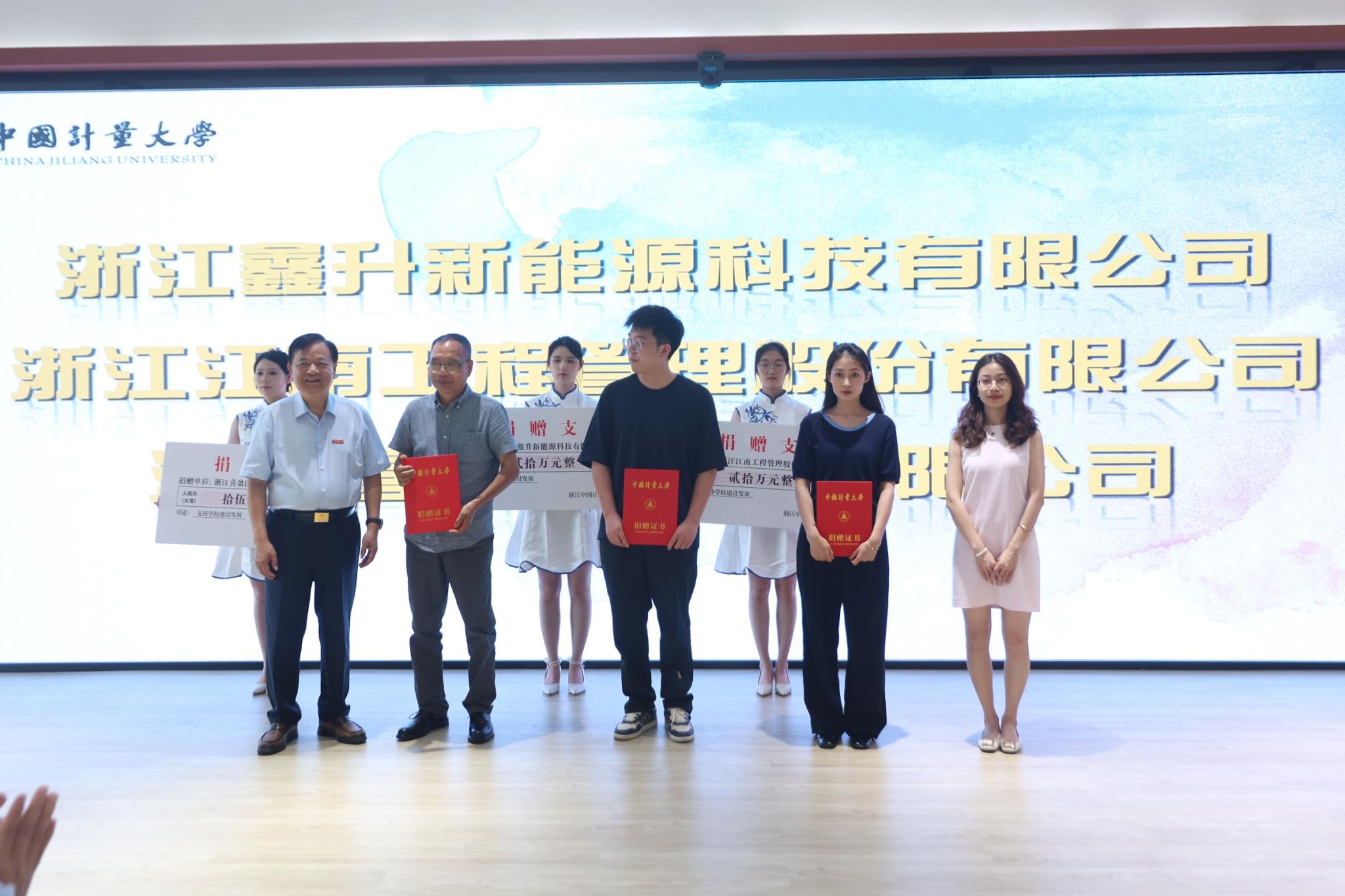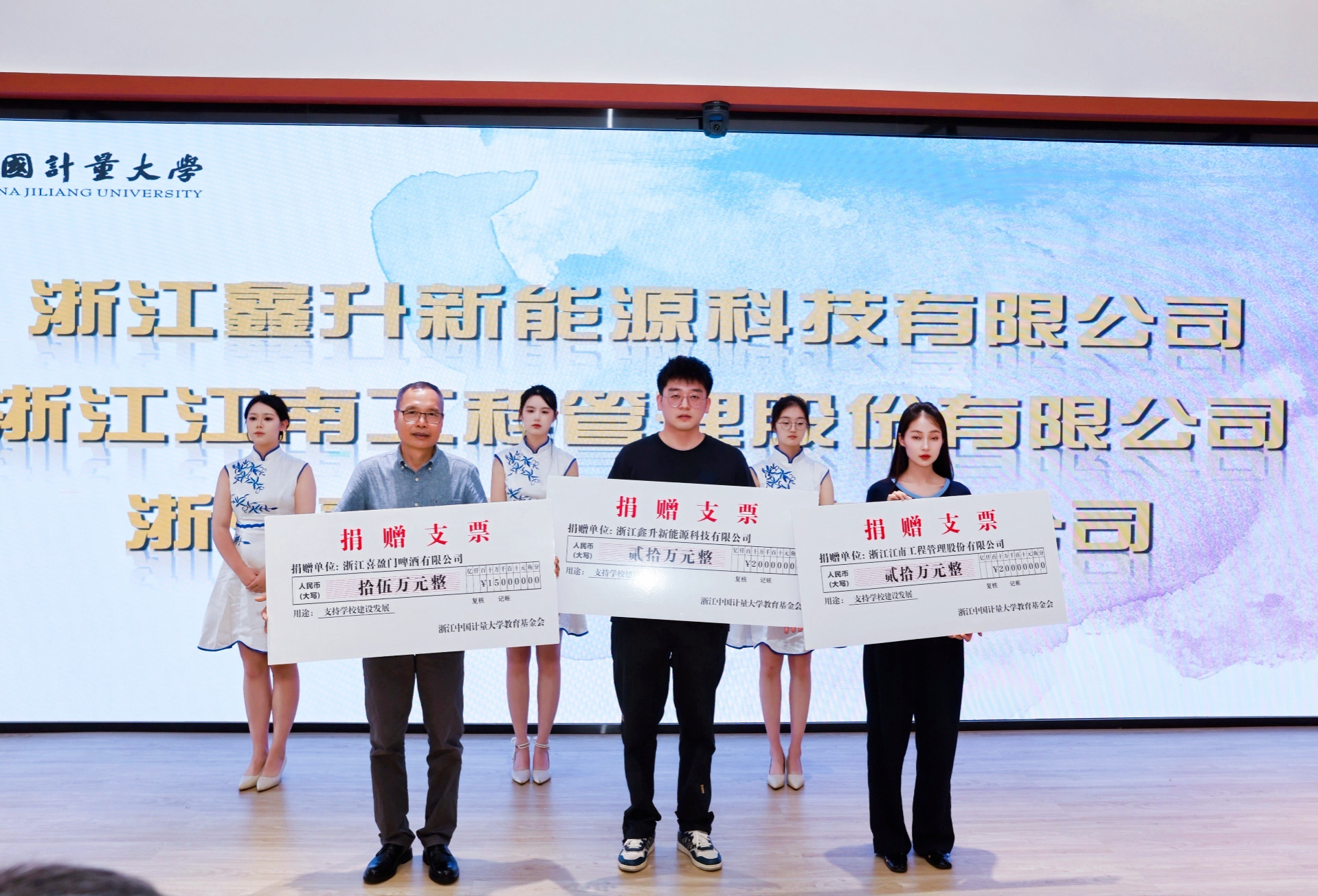 浙江鑫升新能源科技有限公司董事长郑夏均、浙江江南工程管理股份有限公司董事长李建军、浙江喜盈门啤酒有限公司董事长杨海狄三位企业家向学校共捐赠了55万元善款,善款将注入“仕林奖教基金”用于支持艺传学院教育项目。冯时林、倪智丽代表学校接受捐赠,并向企业家代表颁发捐赠证书。