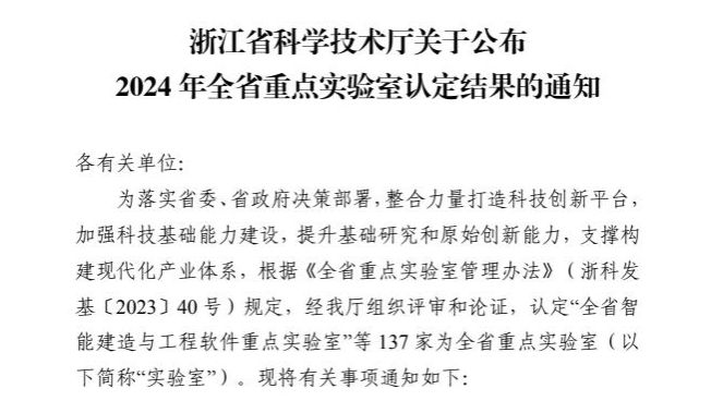 2025年6月3日,浙江省科学技术厅公布了2024年全省重点实验室认定结果名单,由我校牵头的“全省工业碳计量技术研究重点实验室”和“全省光电计量及精密仪器重点实验室”被认定为“全省重点实验室”。