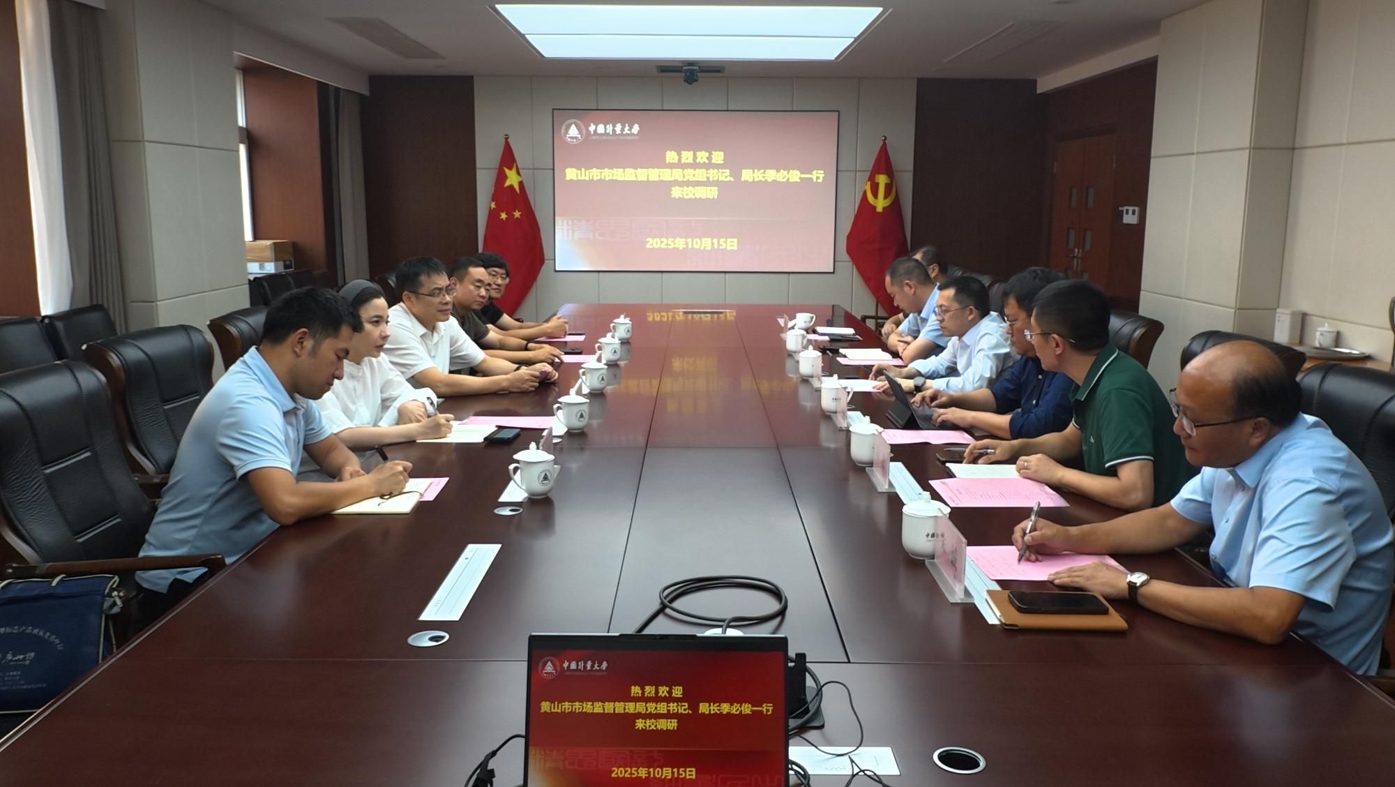 10月15日下午,黄山市市场监督管理局局长季必俊一行来校调研交流。校党委副书记、副校长(主持行政日常工作)戴道锌会见了客人,副校长夏昶祺出席并主持座谈会,办公室、外联处、大学科技园管理办公室、生命学院和黄山高质量发展研究院等单位相关负责人参加。