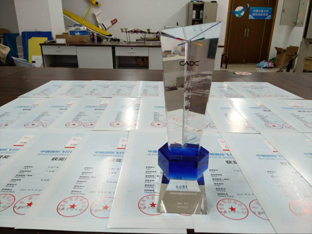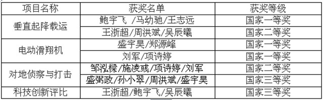在院领导、相关系部、实验中心的大力支持下,我院航模队共派出了由14名同学组成的6支参赛队,分别参加了垂直起降、电动滑翔机、对地侦察三个项目的角逐。在垂直起降项目中获国家一等奖1项、国家二等奖1项,团体第四名,并获科技创新评比三等奖;在电动滑翔机项目中获国家一等奖2项,团体第四名;在对地侦查项目中获国家二等奖1项、国家三等奖1项。获奖等级及获奖数量在全国同类院校中排名第一,在全部代表队中也名列前茅。各项目参赛作品的科技水平及创新性更是得到了赛会专家以及兄弟院校代表队的广泛赞誉。