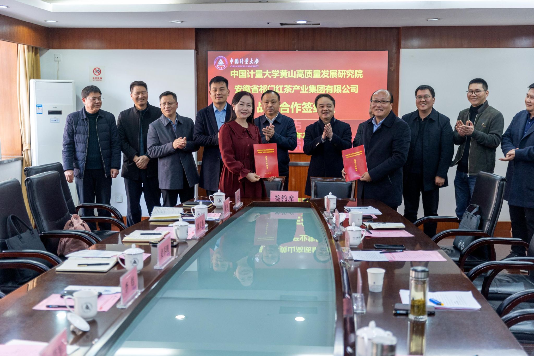 为助力安徽省祁门红茶产业集团有限公司发展,会议举行了中国计量大学黄山高质量发展研究院与安徽省祁门红茶产业集团有限公司战略合作协议签约仪式,祁门红集团总经理姜红和我校黄山研究院院长朱诚代表双方签字。