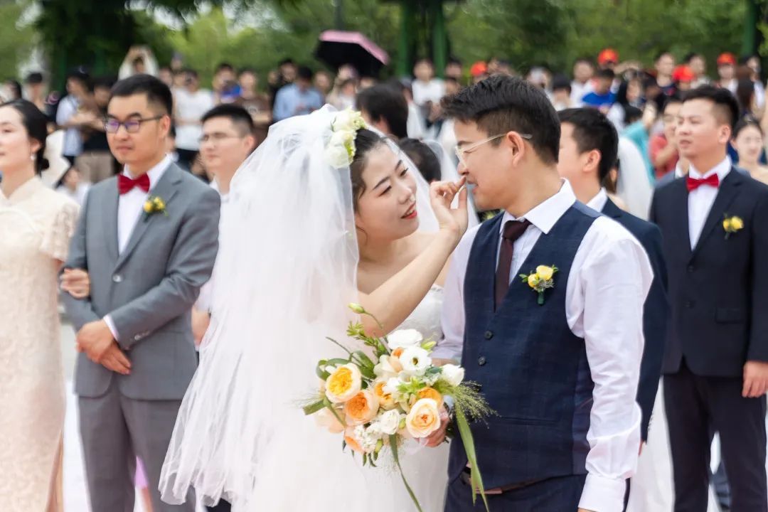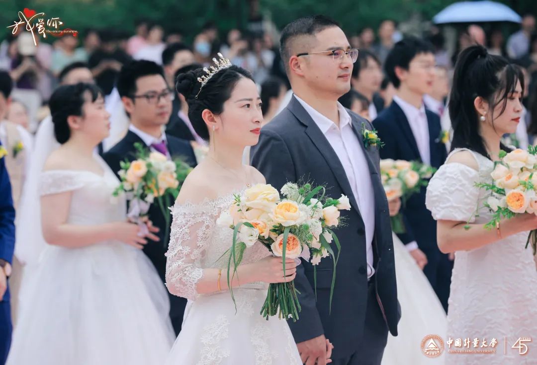 均钟合唱团带来歌曲《今天你要嫁给我》,幸福感在现场弥漫。新人们伴着歌声互相对视,或微笑牵手,或感动落泪。学校精心为每一对新人准备了伴手礼,包含定制戒指、喜糖礼盒、定制婚书、定制U盘、定制水杯,让新人们感受到母校的拳拳爱意。新郎新娘取下定制戒指,为眼前这位共度余生的爱人戴上。而对于史叶欣和王月华来说,这场婚礼比其他人多了一层特别的含义,这是他们第一次举办正式的婚礼。“我们在2020年12月领证了,但一直没办婚礼。感谢母校为我们举行了这次仪式,对我们来说意义重大。”史叶欣说。在浪漫、欢乐的领舞气氛中,新人们共同起舞,为集体婚礼划下句点。