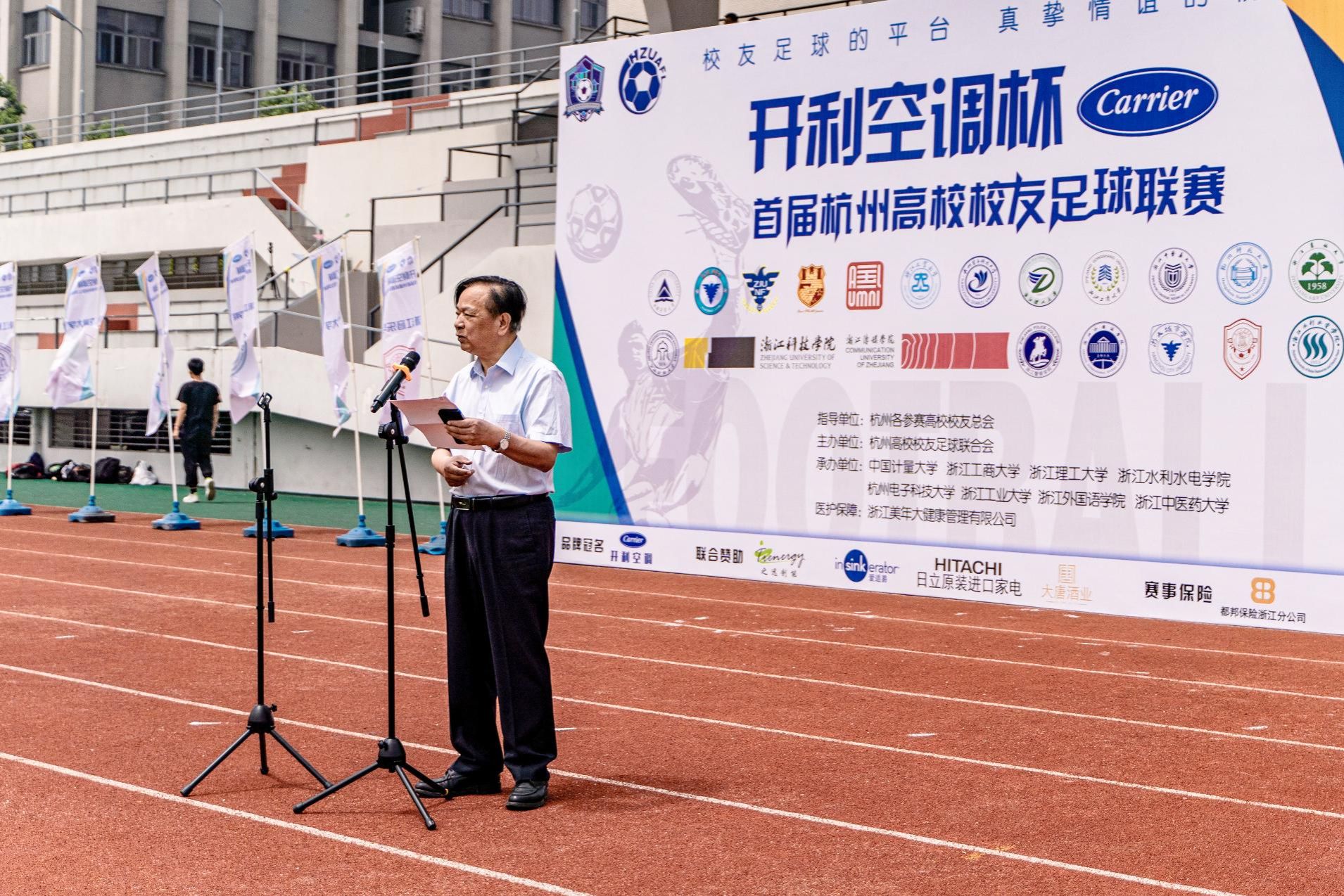 我校发展委员会副主任、校友总会会长冯时林出席开幕式并致辞。他代表学校对各位校友和兄弟高校校友代表的到来表示欢迎,他指出,母校成就校友,校友是母校的名片,校友会则是母校与校友间联系的重要桥梁,大家以足球的名义,共叙同窗情谊,共享母校荣光。祝愿各位运动员们赛出水平,赛出风格,积极为母校争光,希望各高校校友通过比赛加强交流与联系,共同为浙江省高校发展做出应有的贡献。杭州高校校友足球联赛主席唐志军,赛事冠名赞助商开利空调代理商昂帆机电总经理郑杭东分别致辞,表示对比赛的美好祝愿。