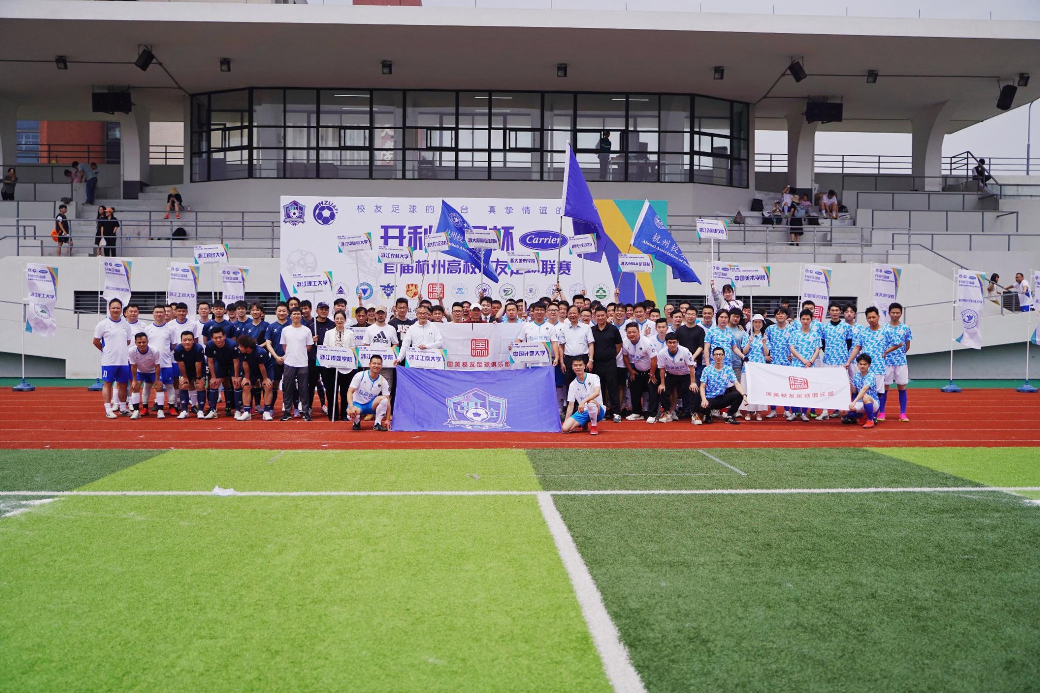 为了加强校友之间的联系和友谊,促进足球运动在校友中的普及和发展,由各在杭高校校友会联合举办的开利空调杯·首届杭州高校校友足球联赛于5月20日在我校东校区足球场盛大开幕。本次比赛由杭州高校校友足球联合会主办,中国计量大学等8家高校承办,20支杭州高校校友足球队运动员和裁判员、各高校校友办代表及赞助商参加了开幕式。