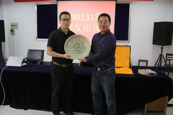 各位校友一一介绍了各自的工作和生活状况,为学校的今天感到欣喜,对老师们曾经给予的教诲与指导表示衷心的感谢。 90131班班长龚伟哲代表班级向学院赠送了婺窑青釉堆塑龙盘,并代表校友发言。他动情地回忆起大学里的那些人、那些事,并畅谈了自己的感想。他说四年的大学时光是他们人生中最最宝贵的时光。在计量,他们收获了纯洁的同学之情、深厚的师生之谊,有些同学收获了珍贵的爱情。所有的这一切都永远烙印在每个人的心中。非常感谢母校、老师对同学们的培育之恩,也衷心希望学校和学院越办越好。