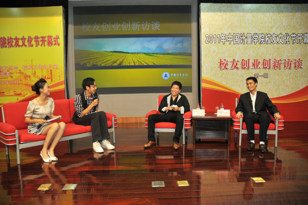 2011年10月9日下午,我校在闻听二楼报告厅隆重举行2011年中国计量学院校友文化节开幕式暨校友创业创新访谈第一期。校长林建忠、副校长冯时林出席,党校办、宣传部、教务处、科技处、研究生部、学生处、团委等部门负责人、各二级学院分管校友工作领导以及校友和学生代表参加了开幕式。