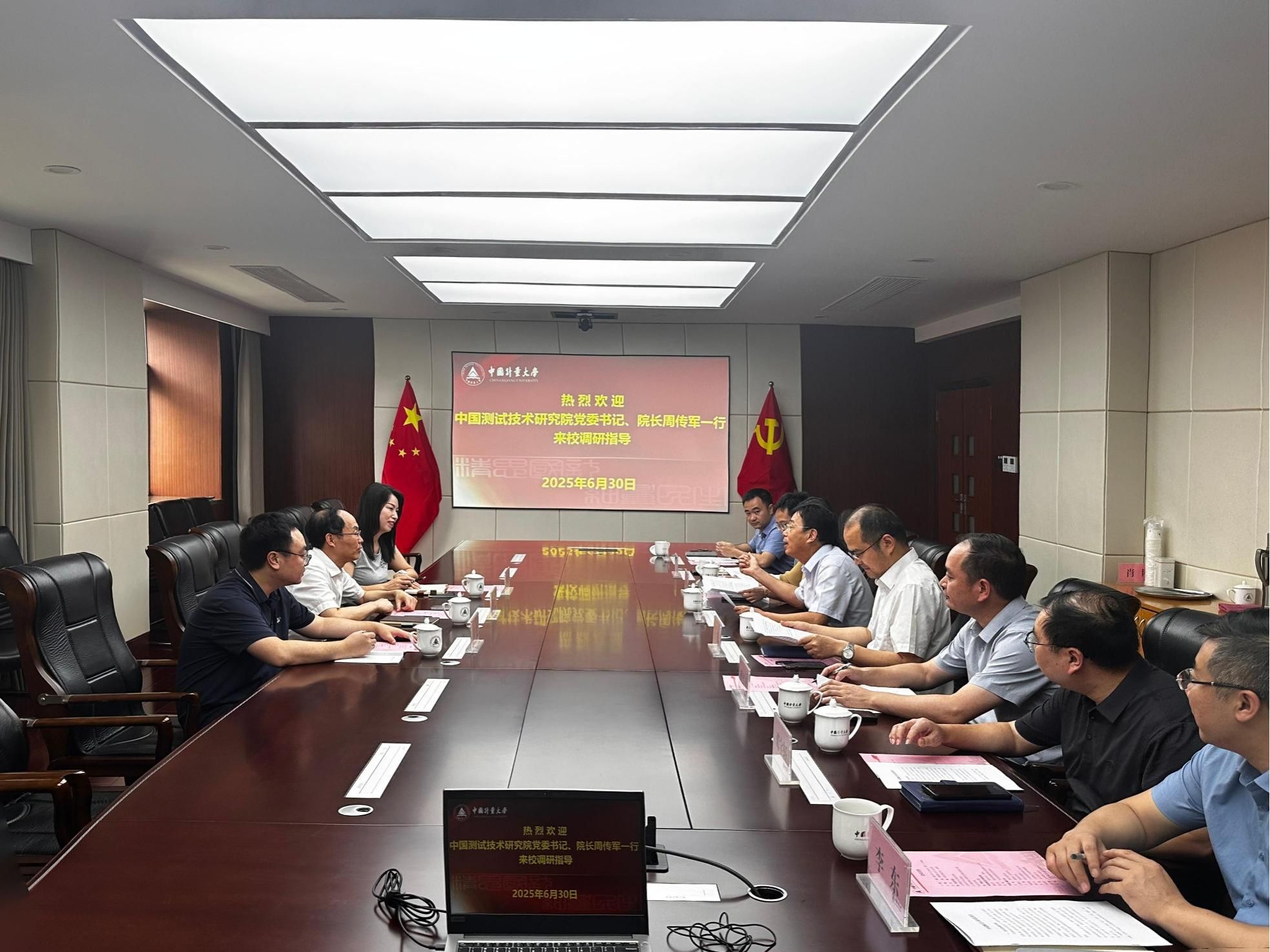 6月30日,中国测试技术研究院党委书记、院长周传军一行来校调研交流。校党委书记徐江荣接见了客人,副校长王新庆出席并主持座谈会,办公室、科研院、研究生院、外联处、大学科技园管理办公室和计测学院等单位负责人参加座谈。