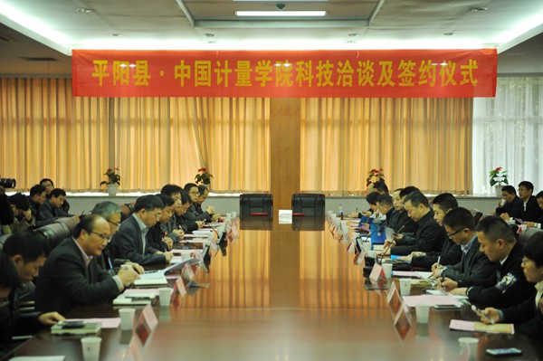 2015年12月4日上午,平阳县·中国计量学院科技洽谈及签约仪式在闻厅一楼会议厅举行。平阳县常务副县长赵乐平、县府办副主任邱君诺、科技局局长温自坚、副局长洪杰、科技局工业科科长张凤静、科技局技术转移中心主任丰丽霞、滨海新区管理委员会副主任李赋以及平阳县各乡镇副镇长和平阳县家一行38人来到我校。我校校友总会常务副会长冯时林、机电工程学院院长孙坚、计测学院副院长蔡晋辉、副书记徐勇、信息学院副院长李九生、质安学院副院长王强、艺传学院副院长高筠以及相关二级学院十余名教师参加了签约仪式及科技洽谈会,会议由俞晓平副校长主持。