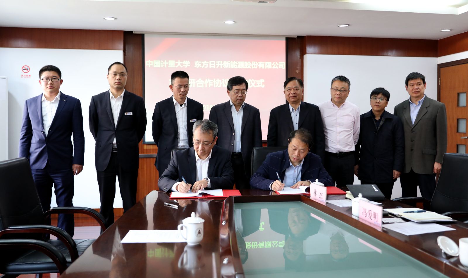 王洪则介绍了公司的发展概况和发展战略,就合作开展人才培养、项目攻关、科技成果转化、国家级项目及平台申报等与学校进行了交流。随后,双方代表签署了《中国计量大学东方日升新能源股份有限公司产学研合作协议》。