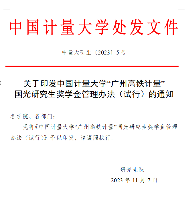 学校制定了《中国计量大学“广州高铁计量”国光研究生奖学金管理办法(试行)》(中量大研生〔2023〕5号),由研究生院组织学院开展奖学金候选人评审和推荐工作。