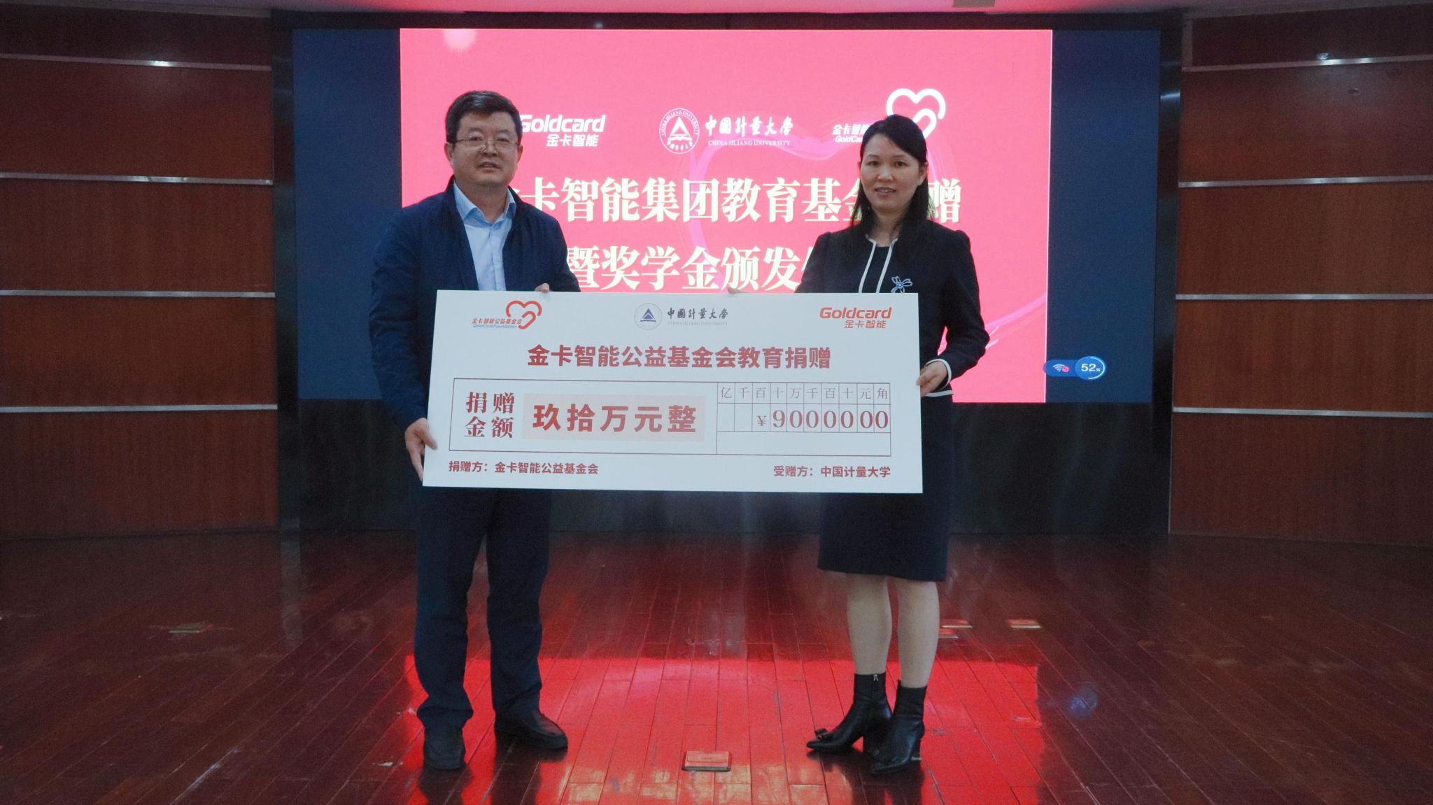 会上,金卡智能公益基金会向我校捐赠90万元用于支持学生成长发展。孔明宣读了金卡智能奖学金的获得者名单,他鼓励获奖同学再接再厉、再创佳绩,参会领导共同为获奖学生颁发证书。