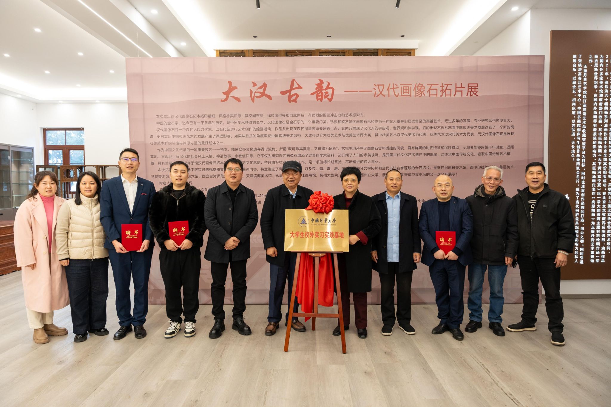 冯时林和周建英为“中国计量大学大学生校外实习实践基地”揭牌。冯时林为杭州墨舞书院院长郝益弘、杭州墨舞书院秘书长黄静奇以及玉振丹青艺术馆馆长申屠小平分别颁发“中国计量大学对外联络顾问”证书。